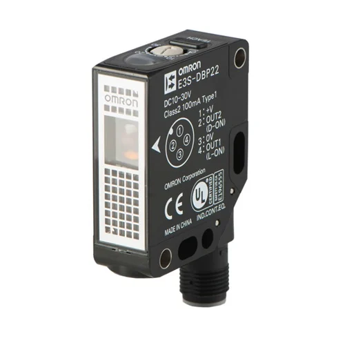 The Omron E3S-DBP22 is a high-performance retro-reflective photoelectric sensor engineered specifically for transparent object detection. Utilizing a narrow, polarized red LED beam (624 nm) and Mirror Surface Rejection (M.S.R.) technology, it ensures reliable detection while mitigating false triggers from shiny backgrounds. The device features "Smart Teach" capabilities and an automatic compensation mechanism for intuitive setup and consistent operation. Housed in a durable PBT/ABS polymer enclosure with a PMMA lens, it is built to withstand harsh industrial environments, carrying both IP67 and IP69K washdown ratings. It operates via an M12 4-pin quick disconnect connector, providing PNP complementary logic (Dark-ON/Light-ON) and a fast response time of 0.5 ms.