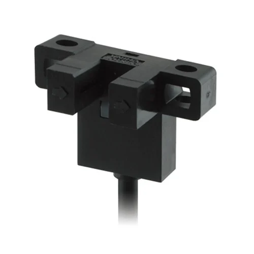 L-shaped 5mm slot sensor with 1 kHz response, NPN output, and 1m robot cable. Compact infrared detection for CNC home positioning and high-speed packaging equipment.