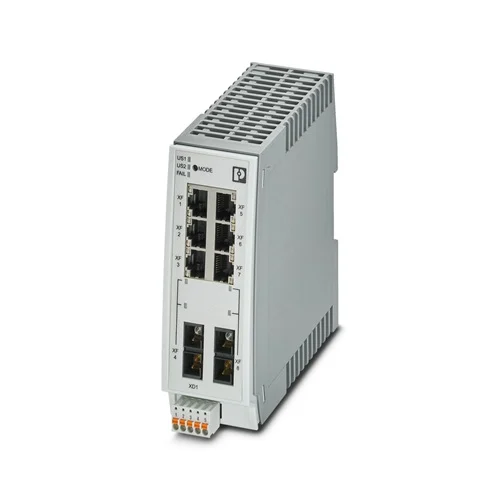 The Phoenix Contact FL SWITCH 2206-2FX is a managed industrial Ethernet switch designed for dependable and secure network communication in challenging industrial environments. It features six RJ45 copper ports and two SC multimode fiber ports for flexible connectivity at 10/100 Mbps. Built to perform in PROFINET and EtherNet/IP™ applications, it offers stable operation in temperatures from –40 °C to +70 °C. Its slim, DIN-rail mountable housing with IP20 protection ensures simple installation even in compact control cabinets, making it ideal for manufacturing, energy, and process control networks that demand continuous data flow.