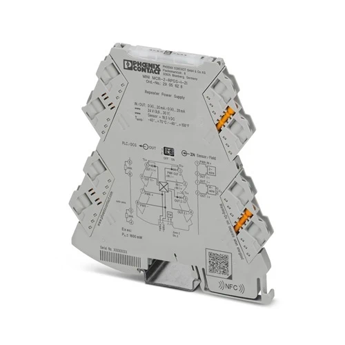 The Phoenix Contact MINI MCR-2-RPSS-I-2I repeater power supply is a compact module that reliably duplicates and isolates analog current signals. With a 6.2 mm slim design, it saves space on DIN rails while providing stable performance in demanding automation environments. The device can split one 0(4)…20 mA input signal into two independent, electrically isolated outputs. It supports HART data transparency, ensuring smooth communication with modern field devices. Featuring integrated fault monitoring and NFC setup capability, this power supply duplicator addresses the need for safe, accurate, and efficient signal distribution in process and factory automation.