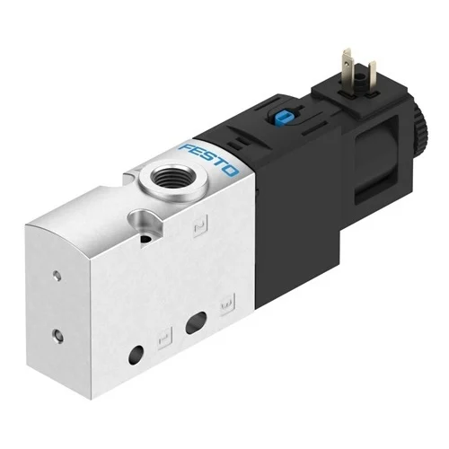 Implementation of the Festo VUVS valve to actuate a single-acting pneumatic kicker or air blast nozzle on a conveyor line. The valve receives a signal from a vision system when a defective product (e.g., uncapped bottle, mislabeled box) is detected. It instantly opens to extend a cylinder or release a high-pressure air burst to eject the item from the main line.